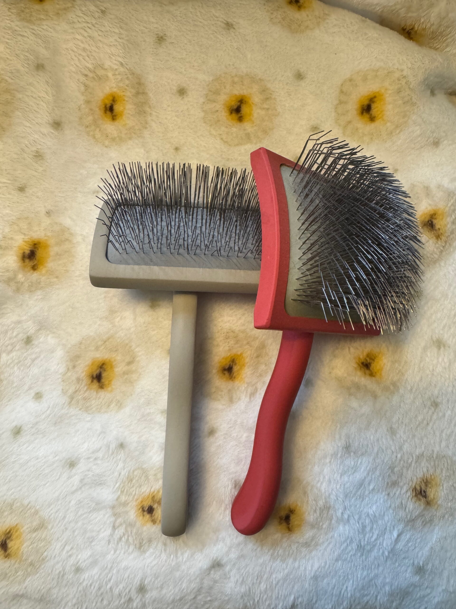 • Purpose: A slicker brush with fine, wire bristles is excellent for everyday grooming. It helps remove tangles, dirt, and loose fur while stimulating the skin.